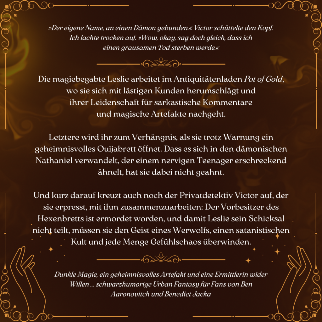 Und kurz darauf kreuzt auch noch der Privatdetektiv Victor auf, der sie erpresst, mit ihm zusammenzuarbeiten: Der Vorbesitzer des Hexenbretts ist ermordet worden, und damit Leslie sein Schicksal nicht teilt, müssen sie den Geist eines Werwolfs, einen satanistischen Kult und jede Menge Gefühlschaos überwinden.